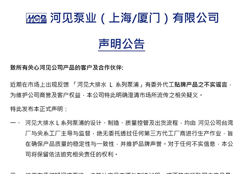 厦门河昌电机有限公司成立于2005年,系河见HCP授权在中国大陆的泵浦制造厂商。公司位于福建厦门市同安区城南工业区,生产的水泵从环保污水设备、农渔业、工程建设到一般排水泵浦,均能满足不同用户的需求。 公司拥有生产及办公厂房、先进的数控CNC机台,多台车床、自动钻床、电机绕线机、各类泵浦检测仪器等专业生产和检测设备,具有丰富工作经验和技术专长的设计、管理、生产人员,产品开发实力雄厚,生产、加工及检测能力超群,全面引进并运用CAD/ CAM/CAE计算机辅助设计、制造、加工分析等先进技术,充分保证了泵浦的制造、加工生产管理、品质控制的规范化、科学化、规模化。 基于河昌电机卓越、优质的生产力以及河见品牌的沉淀及稳定,为了将公司的初衷更好地传承和扩散,2005年起,河见泵业(厦门)有限公司及河见泵业(上海)有限公司先后成功取得河见HCP的授权,正式在中国大陆创立了营业据点。优秀而富有责任心的员工组成专业运营团队,为客户提供了高效、高质量的服务体验。